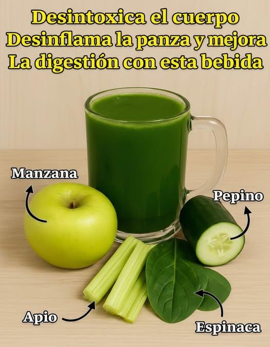 • Fórmula de la Receta (Aproximada): 1 manzana verde, 1/2 pepino, 2 tallos de apio, 1 taza de espinacas. Licúa con un poco de agua o hielo.