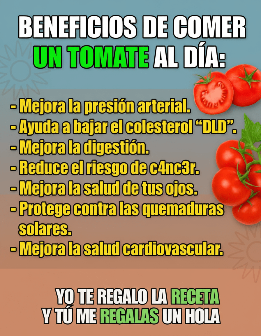 ¡Atención, Amigos del Buen Comer y la Salud! En la mesa de cada hogar latino, existe un fruto humilde, jugoso y de un color vibrante que esconde un arsenal de beneficios. Hablamos del tomate (Solanum lycopersicum), un ingrediente esencial de nuestra cocina, cuyo consumo diario es, según la ciencia, una inversión en tu longevidad. ¿Sabías que un solo tomate al día puede ser tu escudo más potente contra la presión alta, el colesterol dañino, la pérdida de visión, e incluso proteger tu piel del sol?