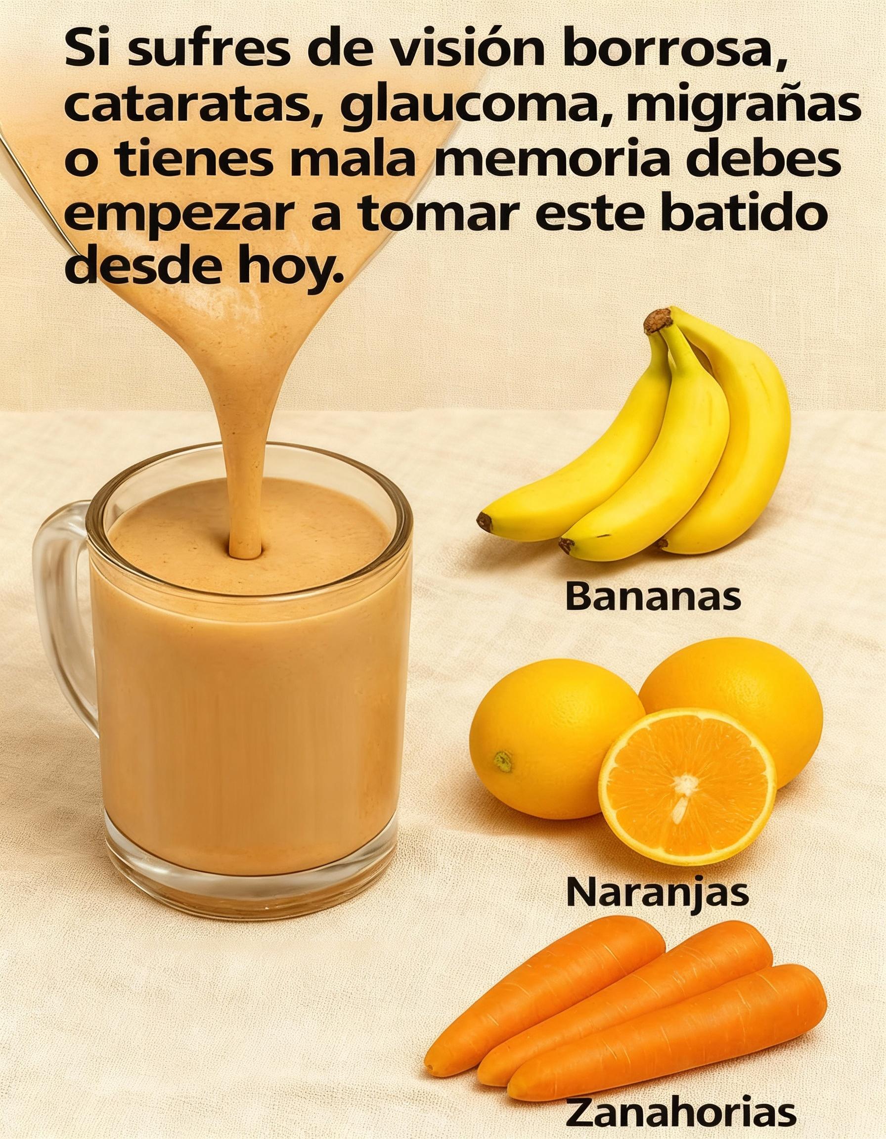 ¿Y si te dijera que el secreto para rejuvenecer tus ojos, fortalecer tu memoria y borrar la visión borrosa y las migrañas se encuentra en un simple, delicioso y potente batido hecho con solo tres ingredientes: Naranja, Banana y Zanahoria? Esta no es una simple receta de desayuno; es una fórmula nutracéutica que combina vitaminas esenciales, carotenoides y electrolitos en una sinergia perfecta para reparar el daño celular y nutrir tu visión y tu cerebro desde dentro.