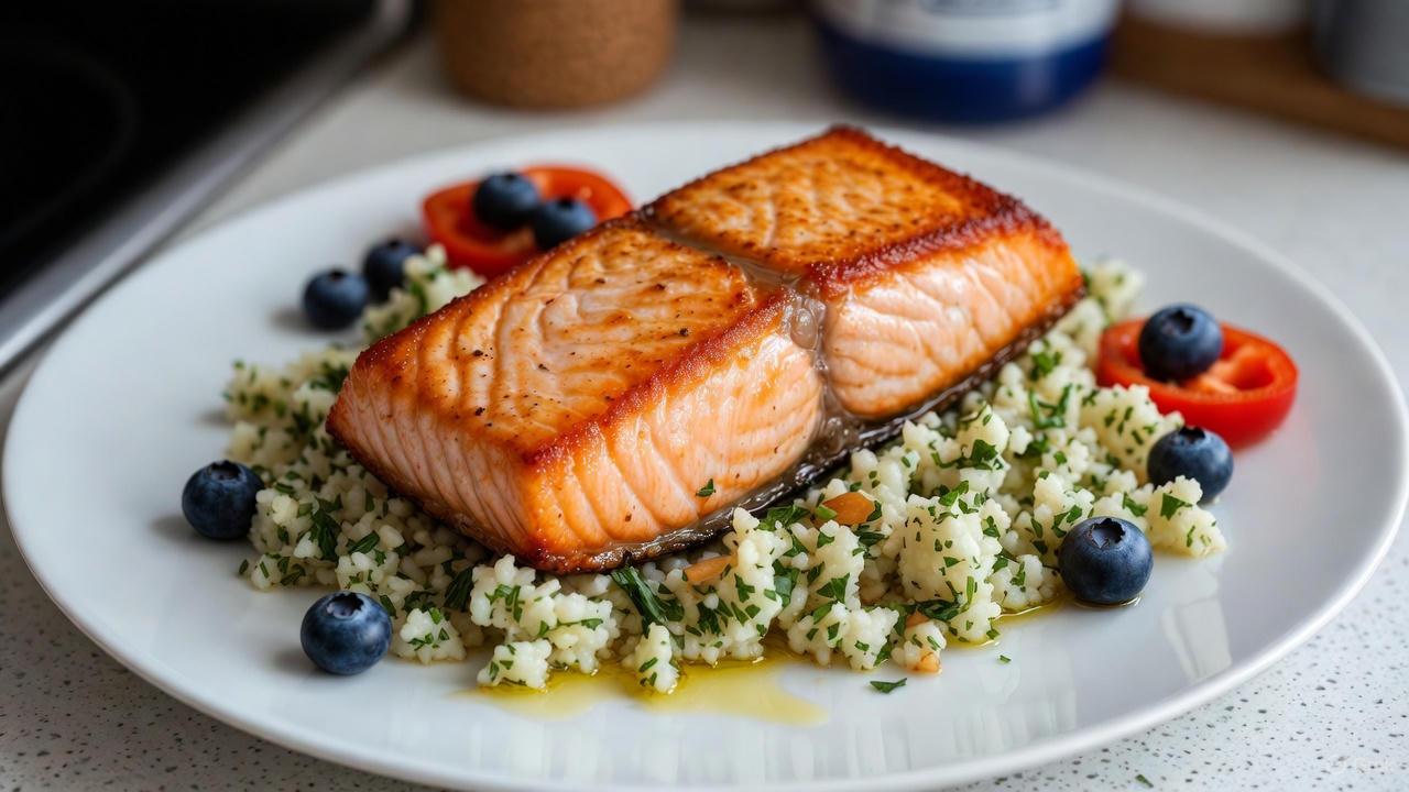 • Lunch: Baked salmon over cauliflower rice drizzled with olive oil and fresh garlic