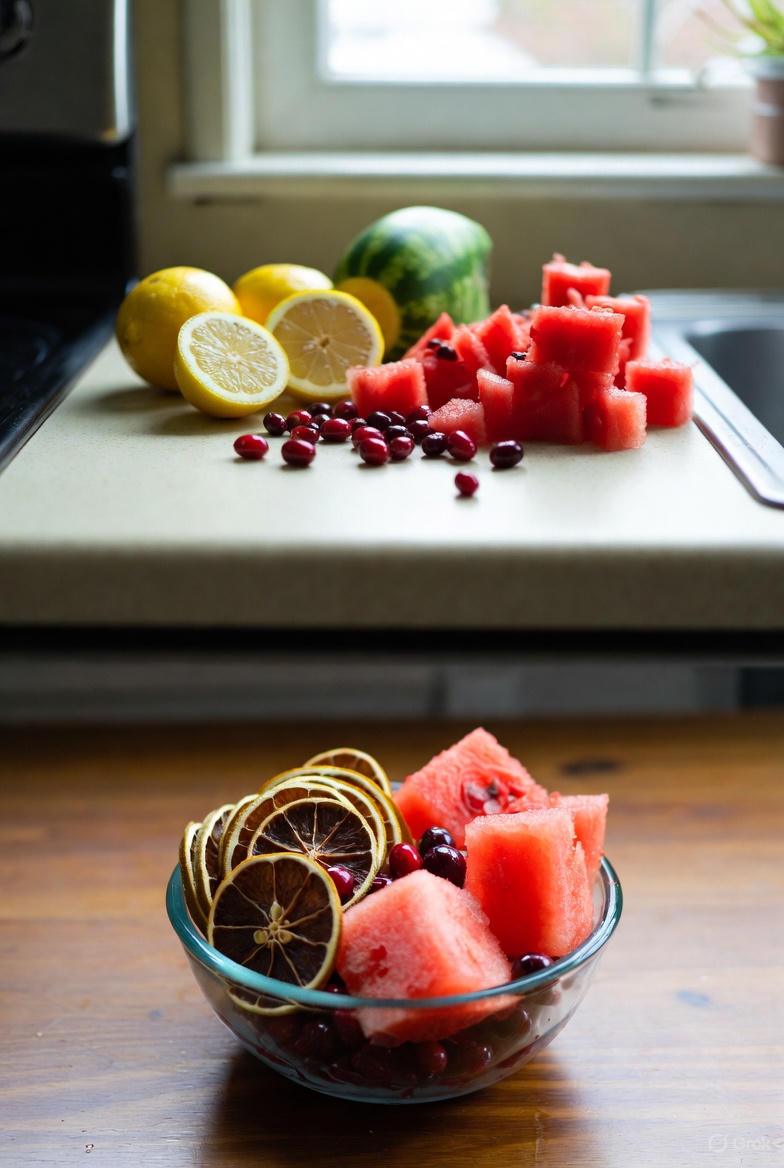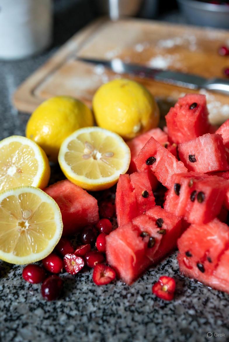 - Prepare fresh – Wash fruits thoroughly. Slice watermelon into bite-sized cubes, juice or slice lemons, and rinse cranberries.