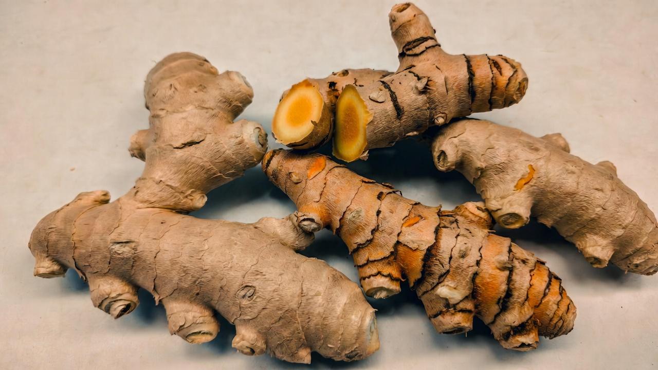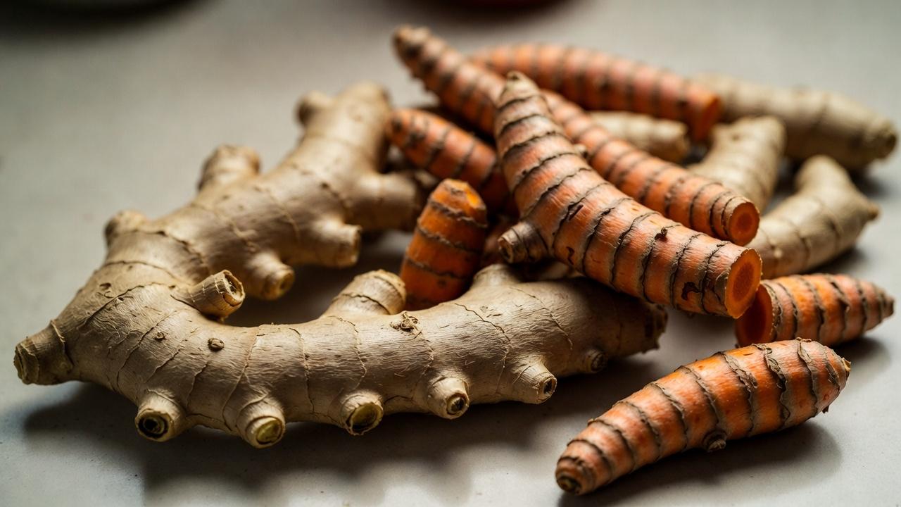 This shows fresh ginger root and turmeric rhizomes ready for slicing — notice the vibrant colors and textures under natural light.