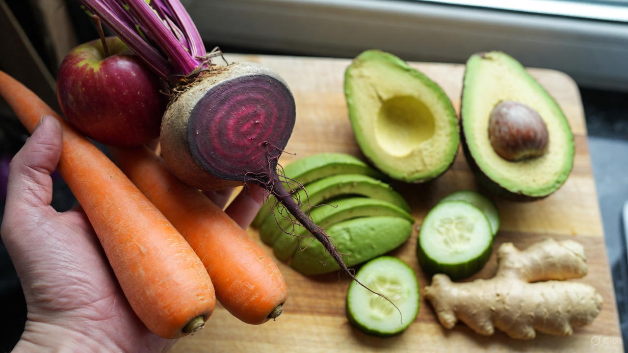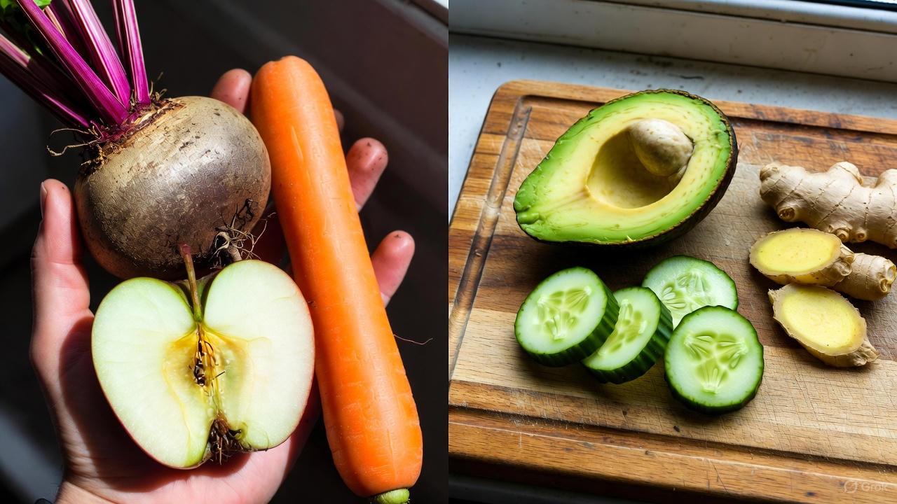 - Ảnh 2: Tập trung vào Avocado + Cucumber + Ginger (cắt lát, đặt trên thớt gỗ, ánh sáng cửa sổ, cảm giác homemade).