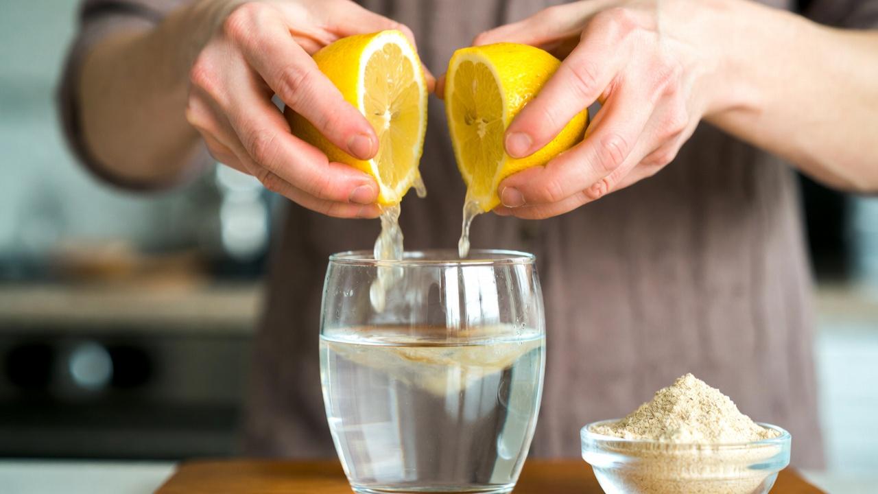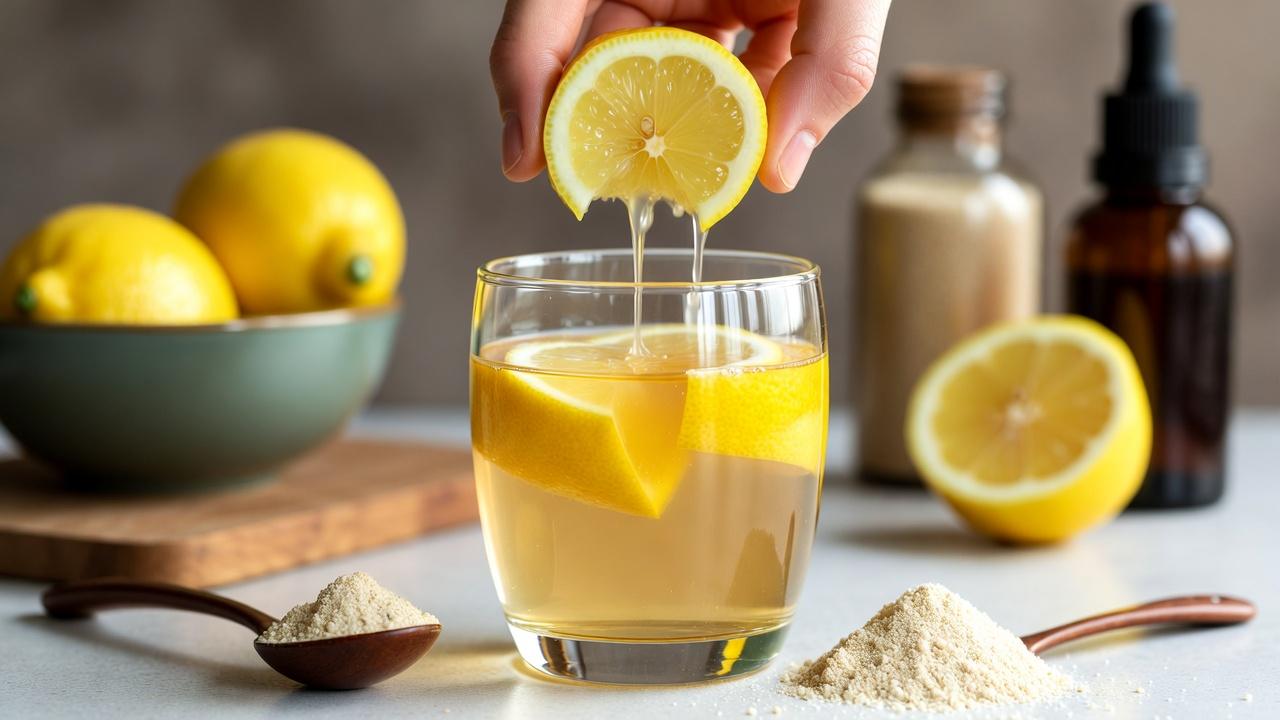 This shows fresh lemons being squeezed into warm water with psyllium husk nearby—perfect for seeing the simple, natural start.