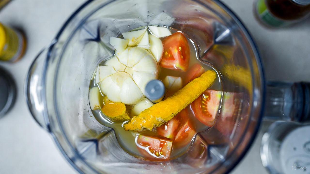 - Add the chopped tomato, garlic, and turmeric to a blender.