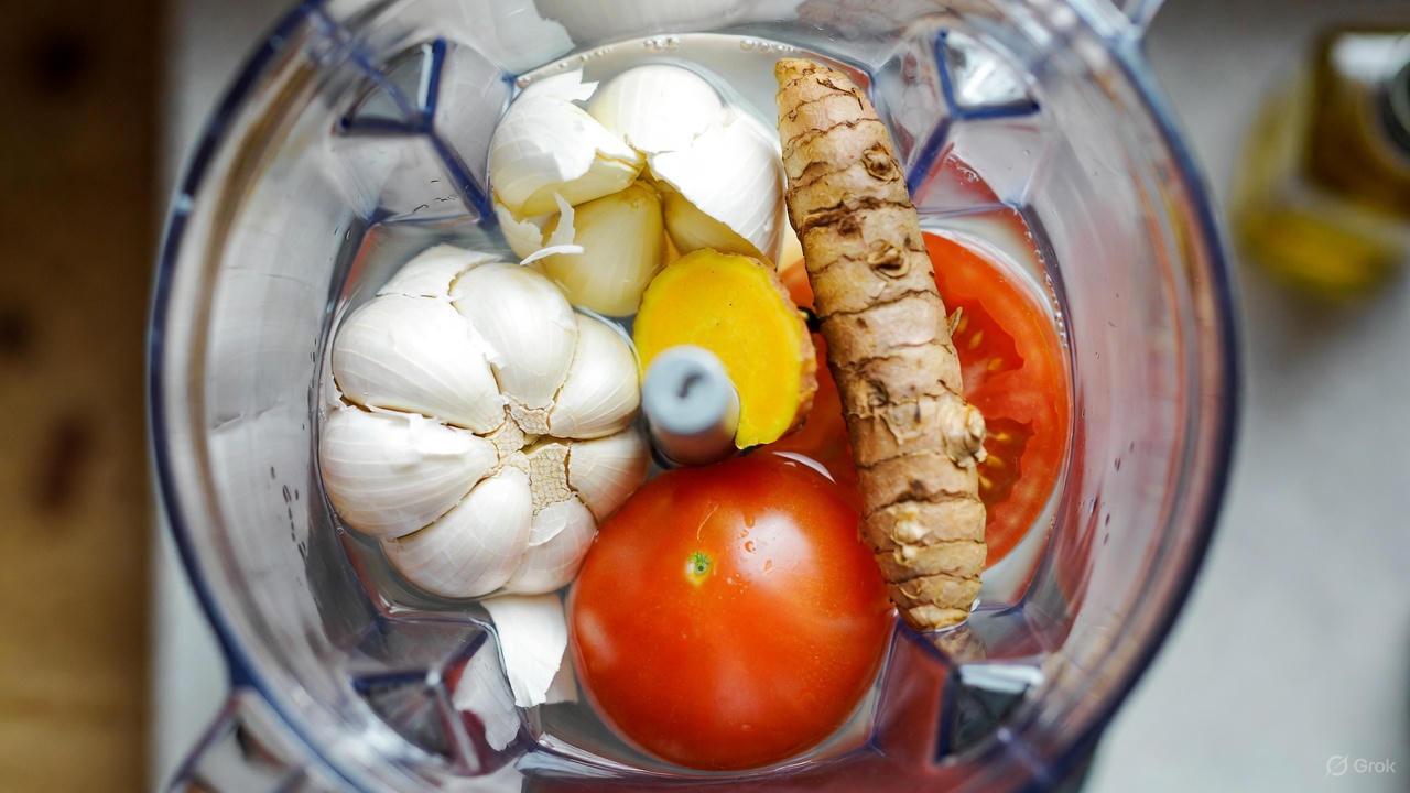 - Gather your ingredients: 1 medium tomato (washed and roughly chopped), 4 cloves of fresh garlic (peeled and chopped), a small piece of fresh turmeric root (about 1 inch, peeled and chopped), and 2 glasses of clean water.