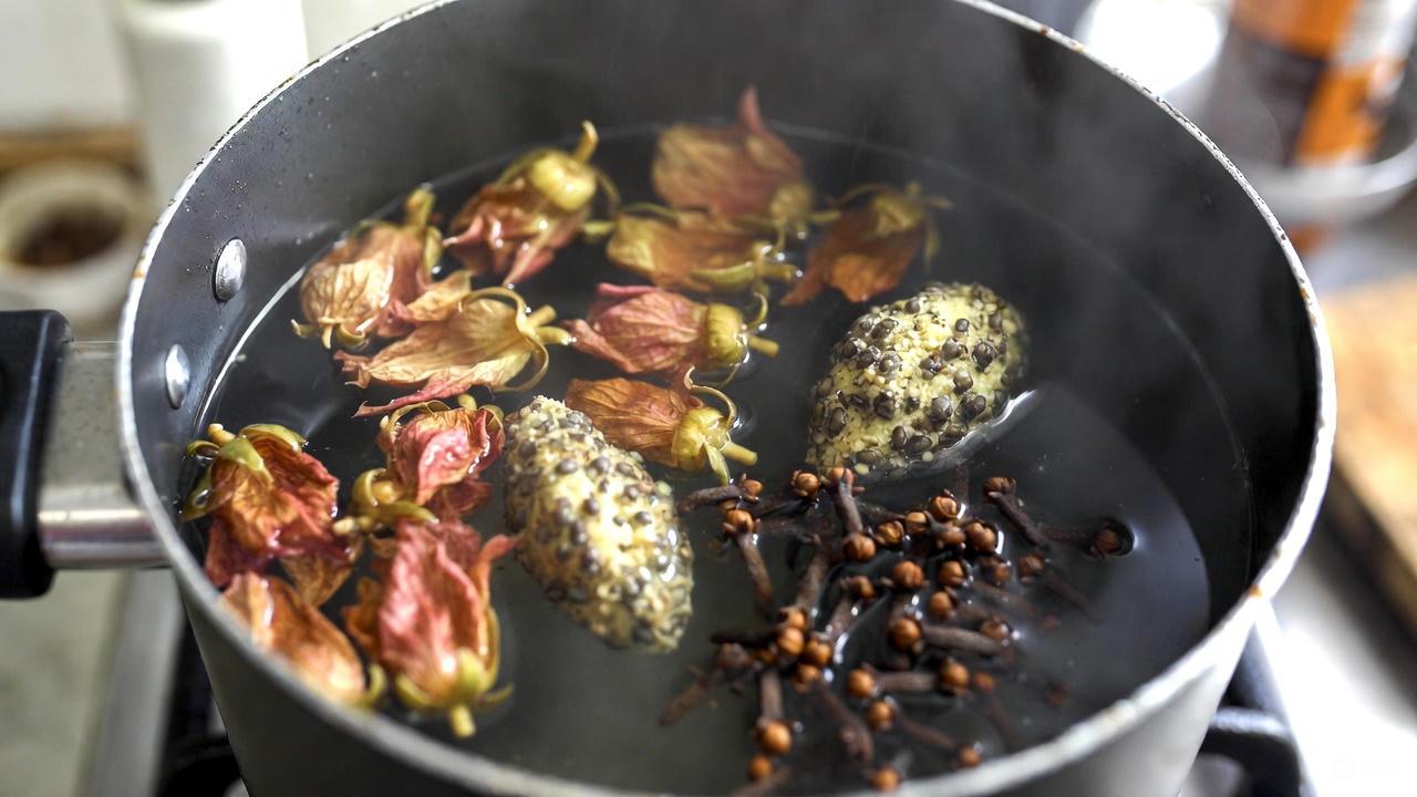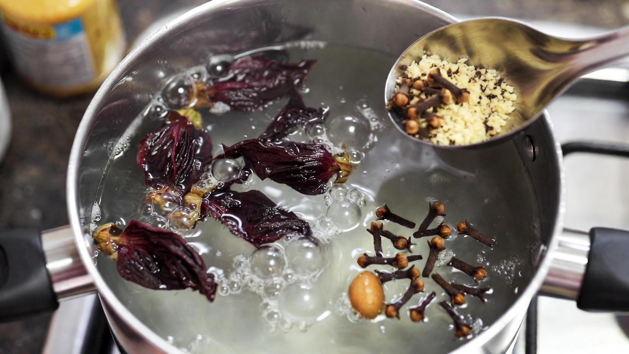 - Add hibiscus flowers, cloves, and grated avocado seed.