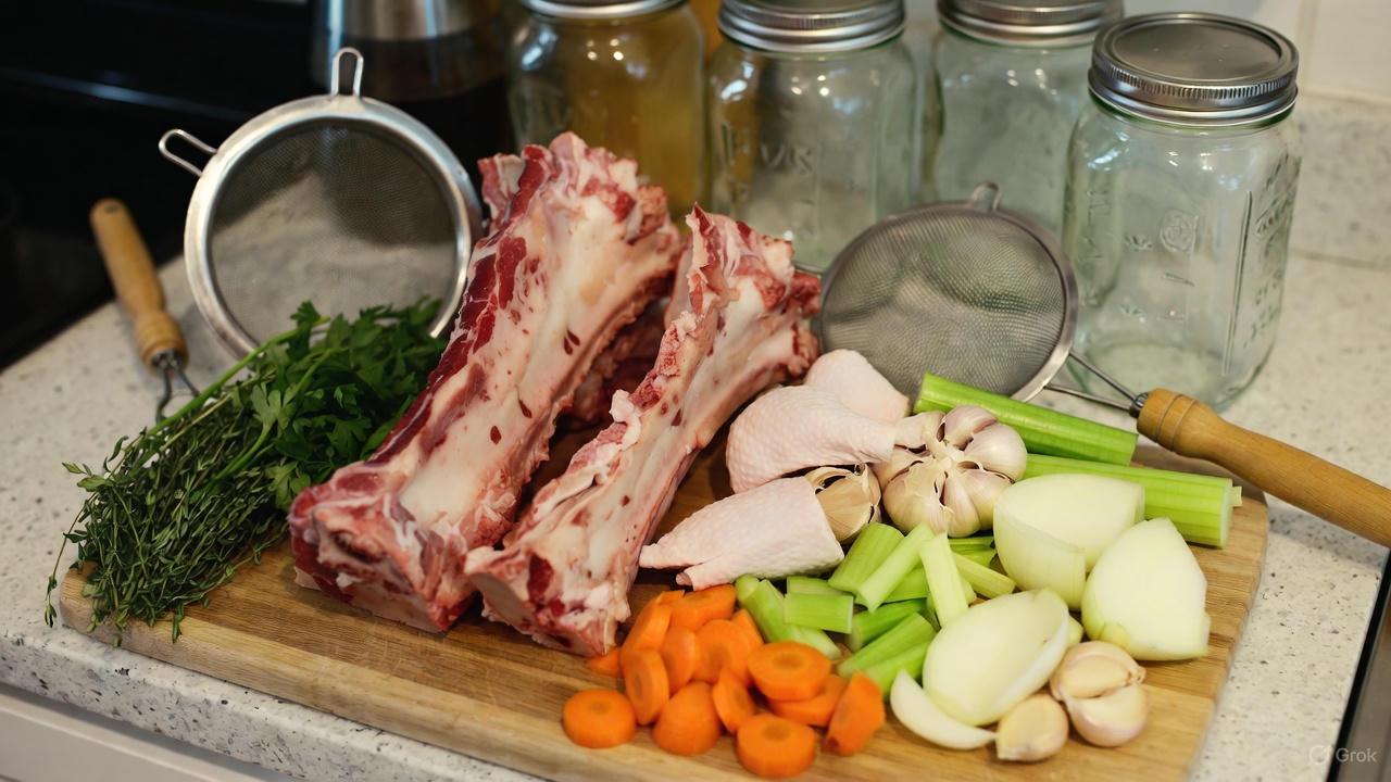- Gather ingredients: 2–3 pounds of beef, chicken, or mixed bones (ask your butcher for soup bones), 1 onion, 2 carrots, 2 celery stalks, a few garlic cloves, fresh herbs, and optional apple cider vinegar.