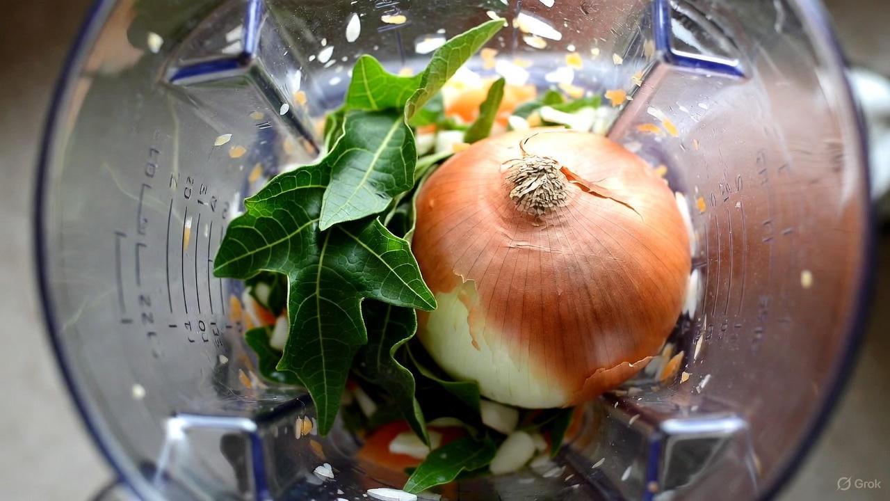 - Prepare the juice: Wash leaves thoroughly. Blend with peeled onion and a bit of water. Strain for liquid.