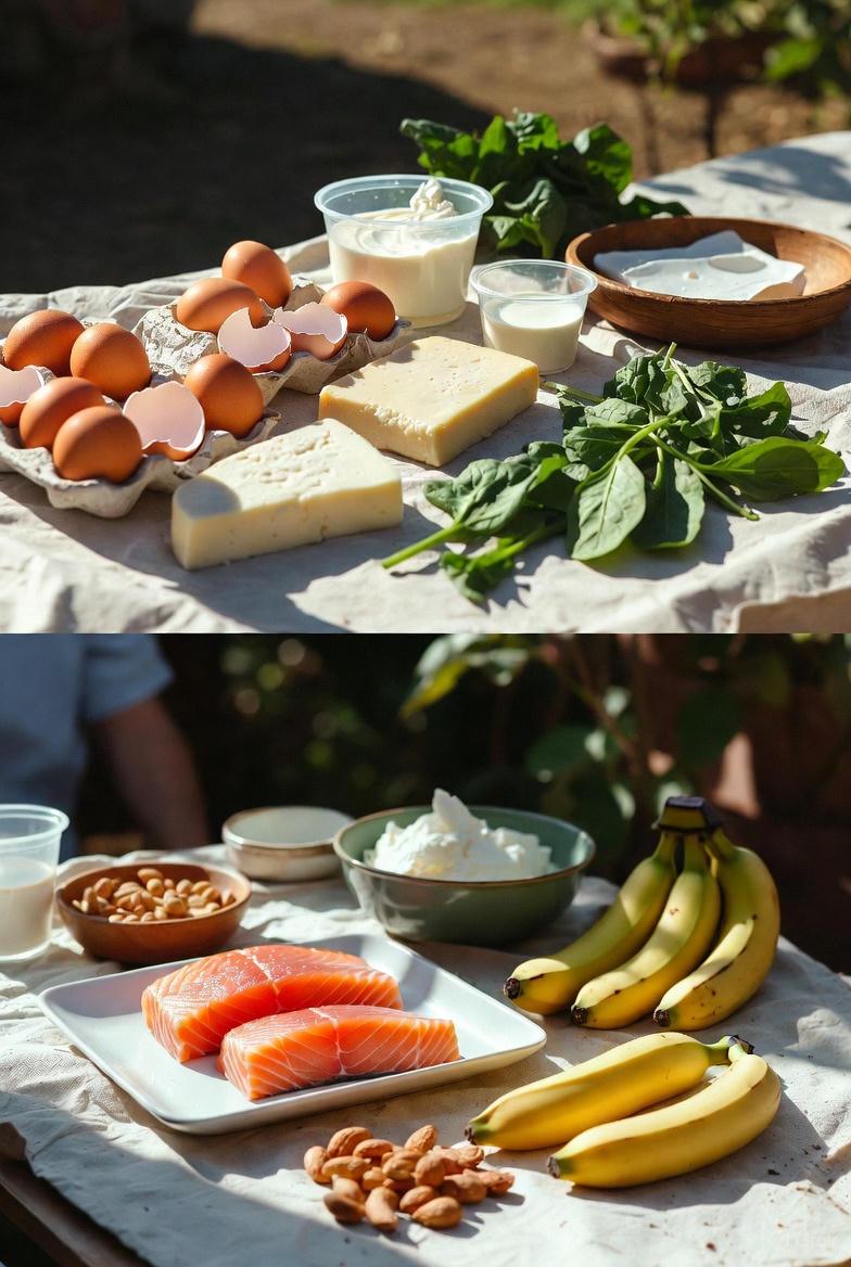 - For Vitamin D: Fatty fish such as salmon, fortified milk, or mushrooms exposed to sunlight.