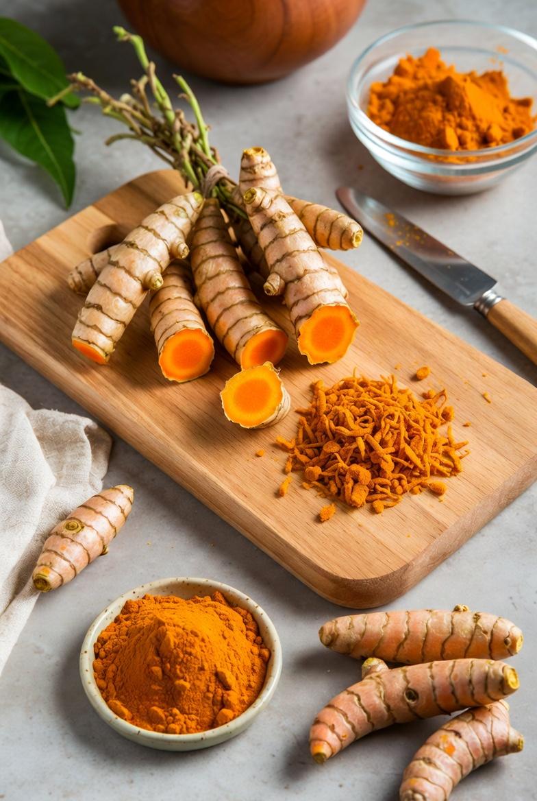 Here are two realistic photos showing fresh turmeric roots being prepared — one with whole roots and grated pieces on a wooden cutting board under natural kitchen light, and another with dried turmeric powder in a small bowl next to fresh roots, capturing everyday textures and soft shadows.