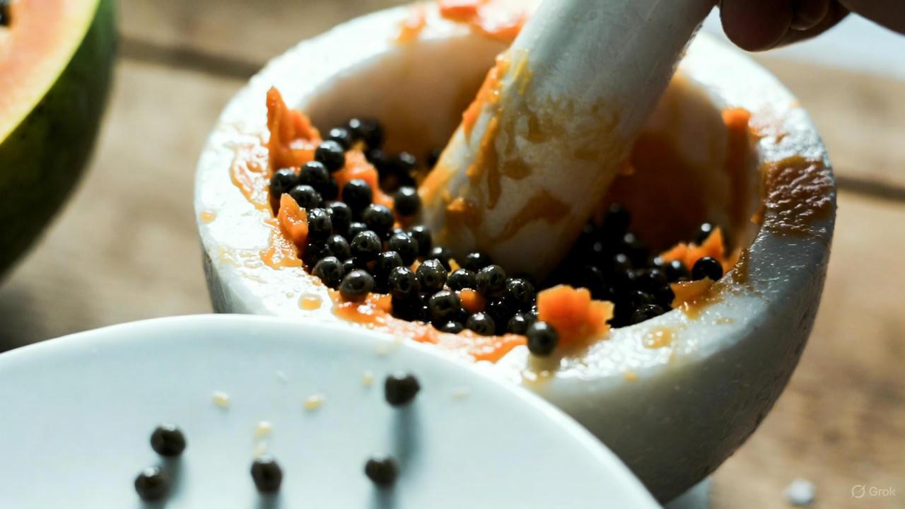 (Image: Fresh papaya seeds being gently crushed with a mortar and pestle on a wooden surface, natural daylight filtering in, showing their glossy black texture and a few scattered on a white plate.)