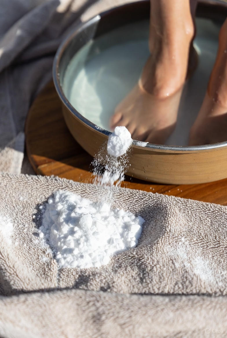 Dissolve a quarter cup of baking soda in warm water. Soak feet for 10 minutes, then dry and moisturize.