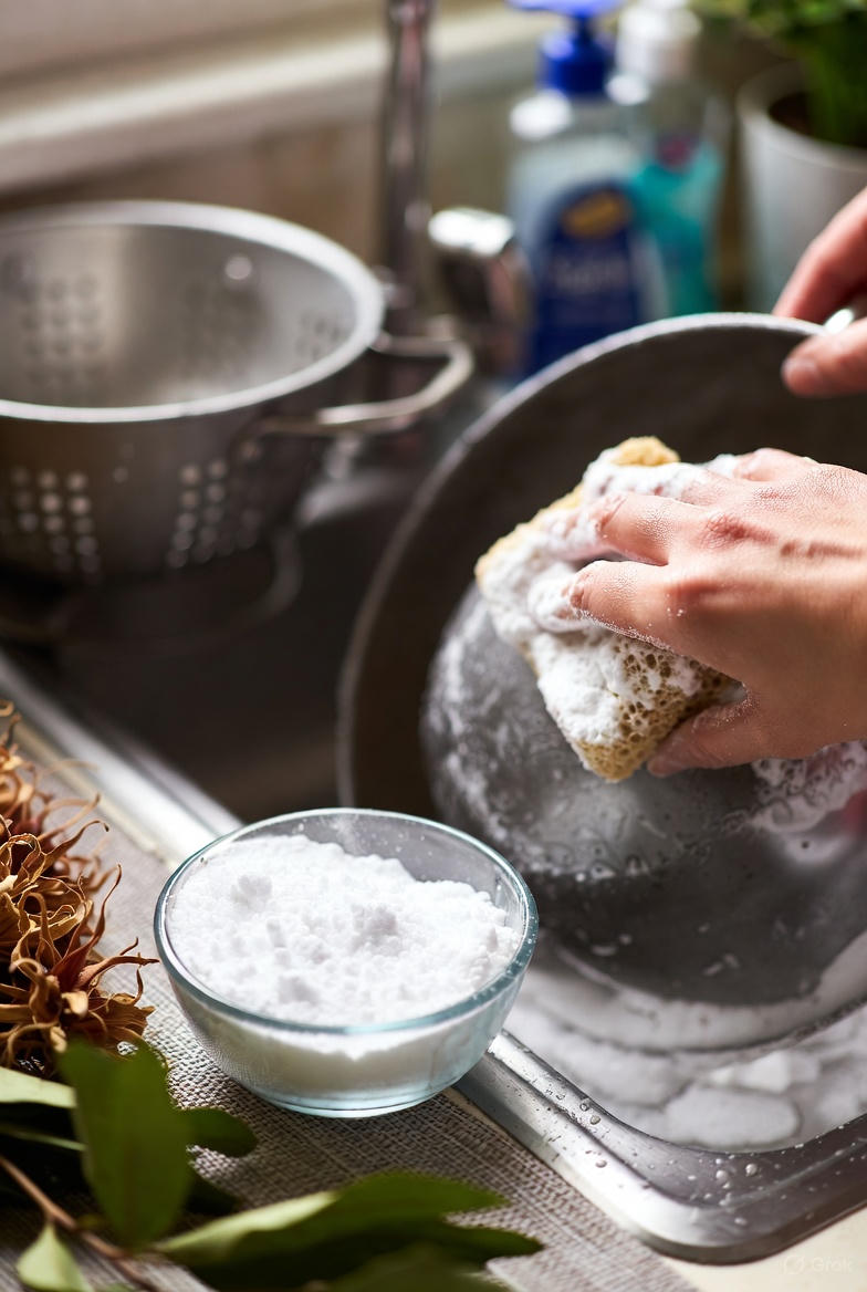 Apply baking soda to stuck-on food, add hot water, let soak, then scrub. This loosens grime easily.