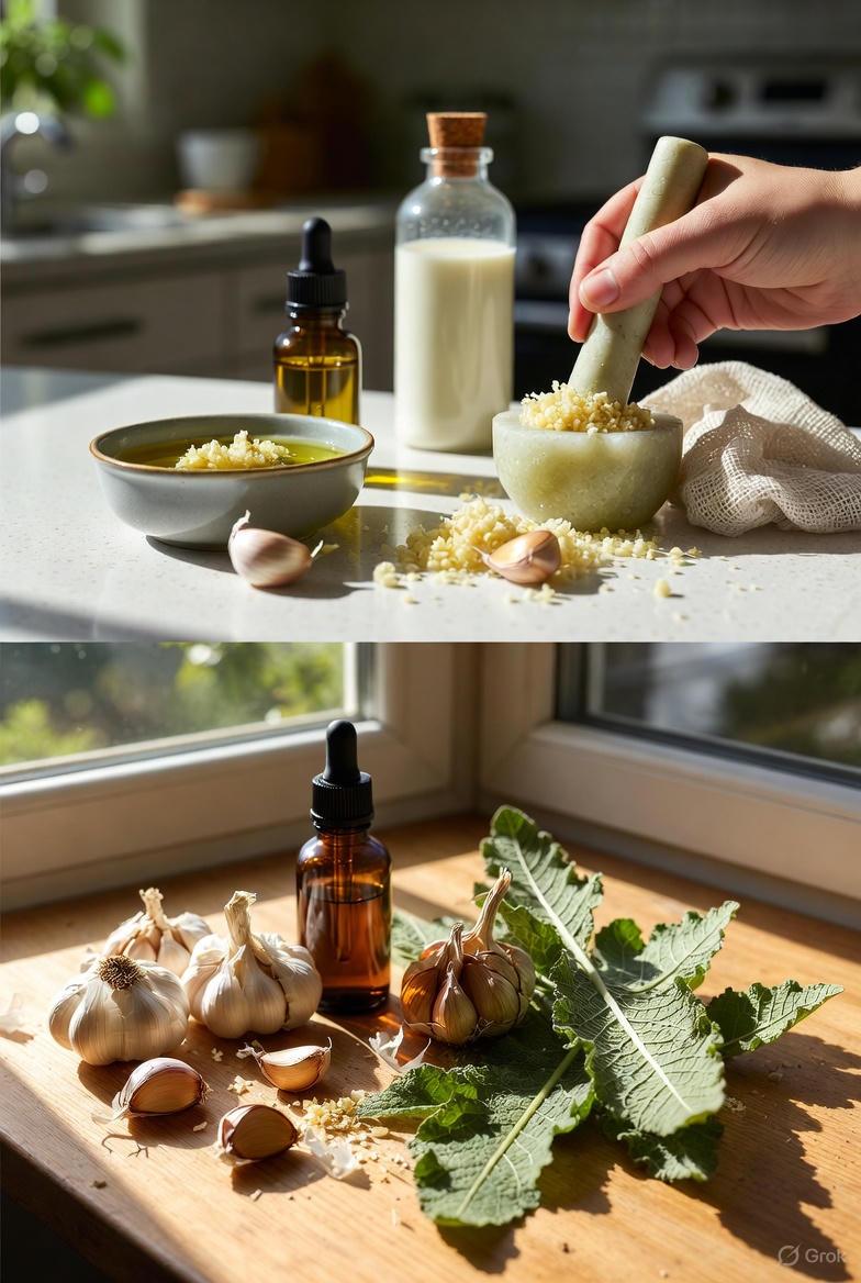 - Crush 3-4 fresh garlic cloves and let sit for 10 minutes (activates allicin).