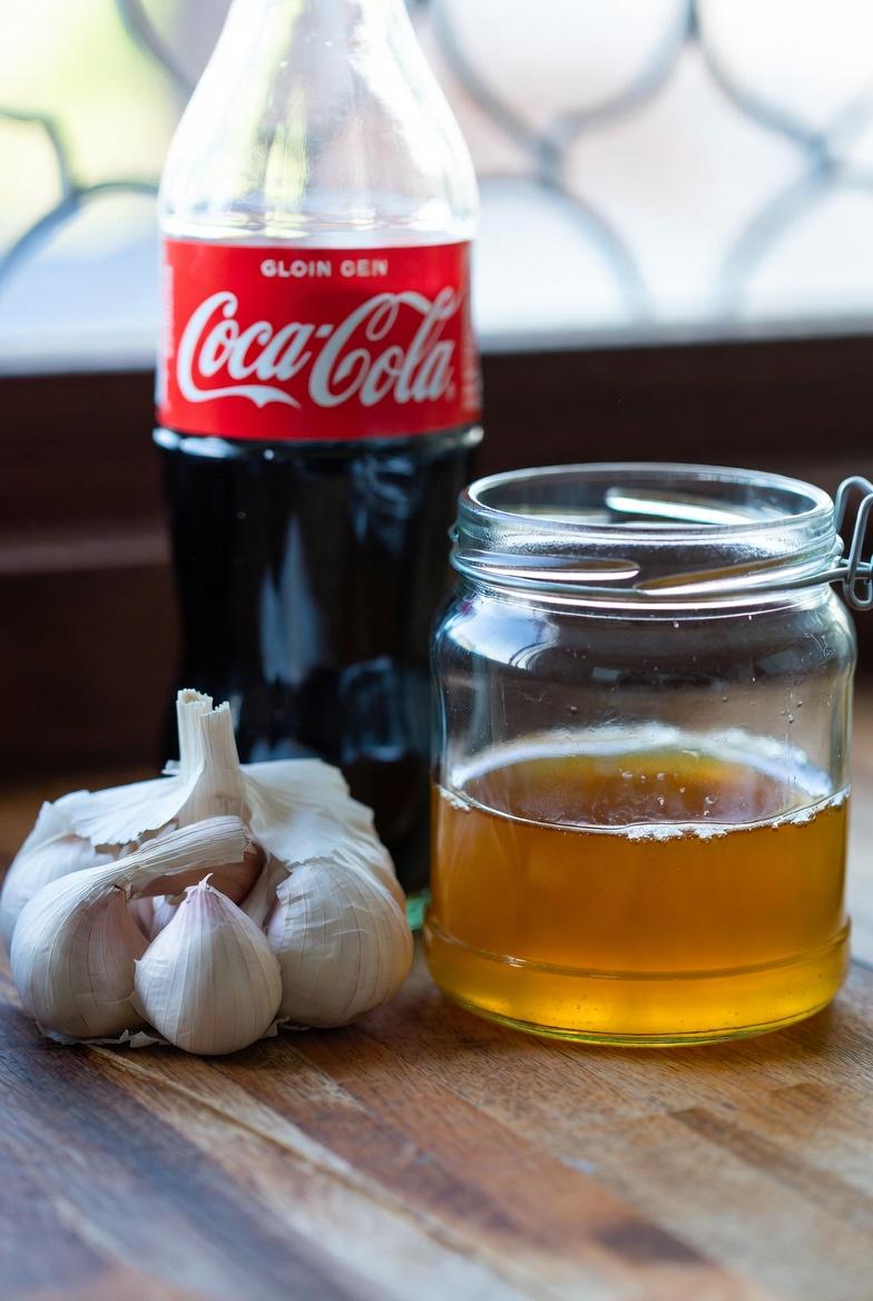 - Gather your ingredients: One bulb of garlic, a bottle of Coca-Cola (about 200ml), and two tablespoons of honey.