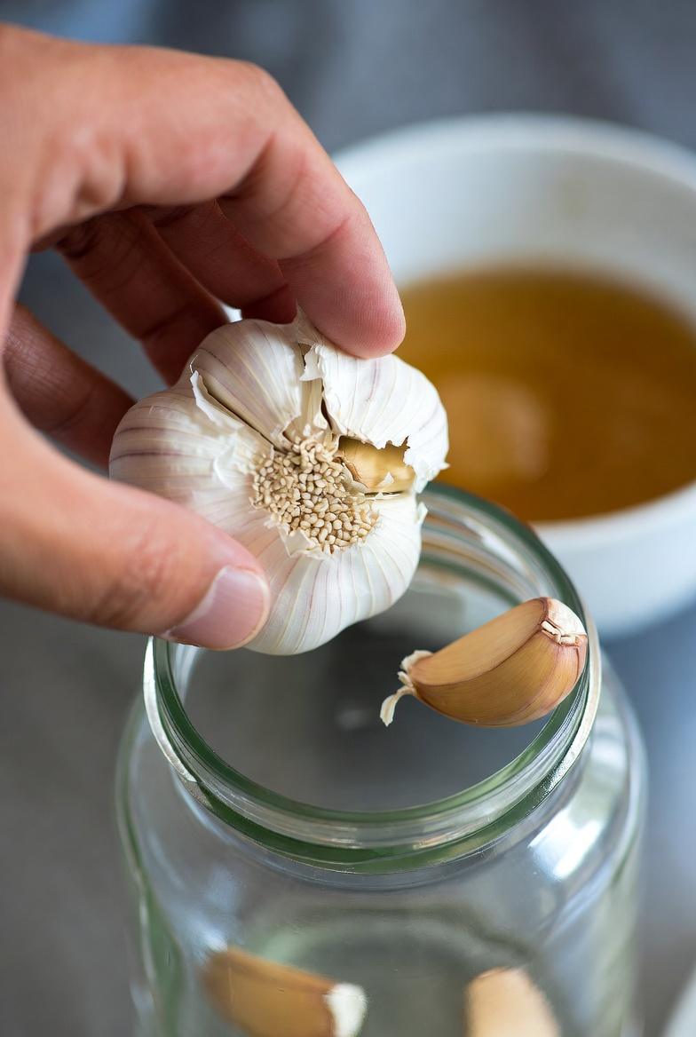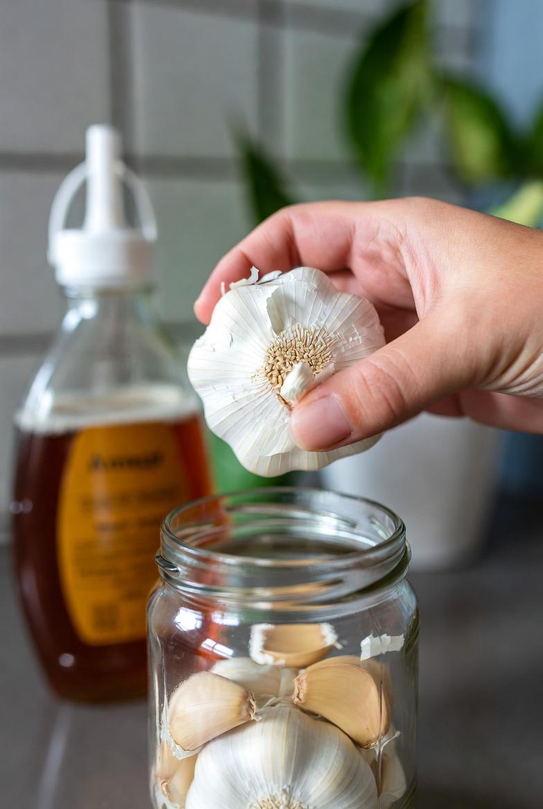 This image captures fresh peeled garlic cloves being placed into a jar before adding honey — notice the natural textures and everyday kitchen lighting.