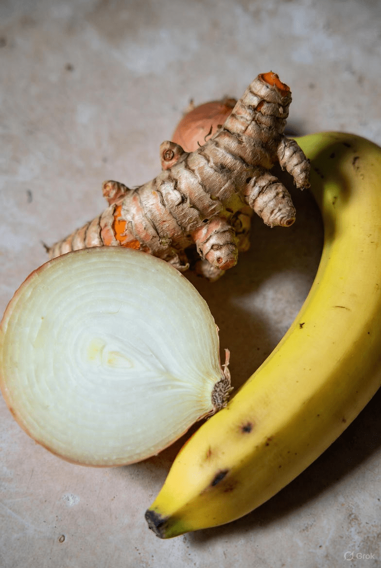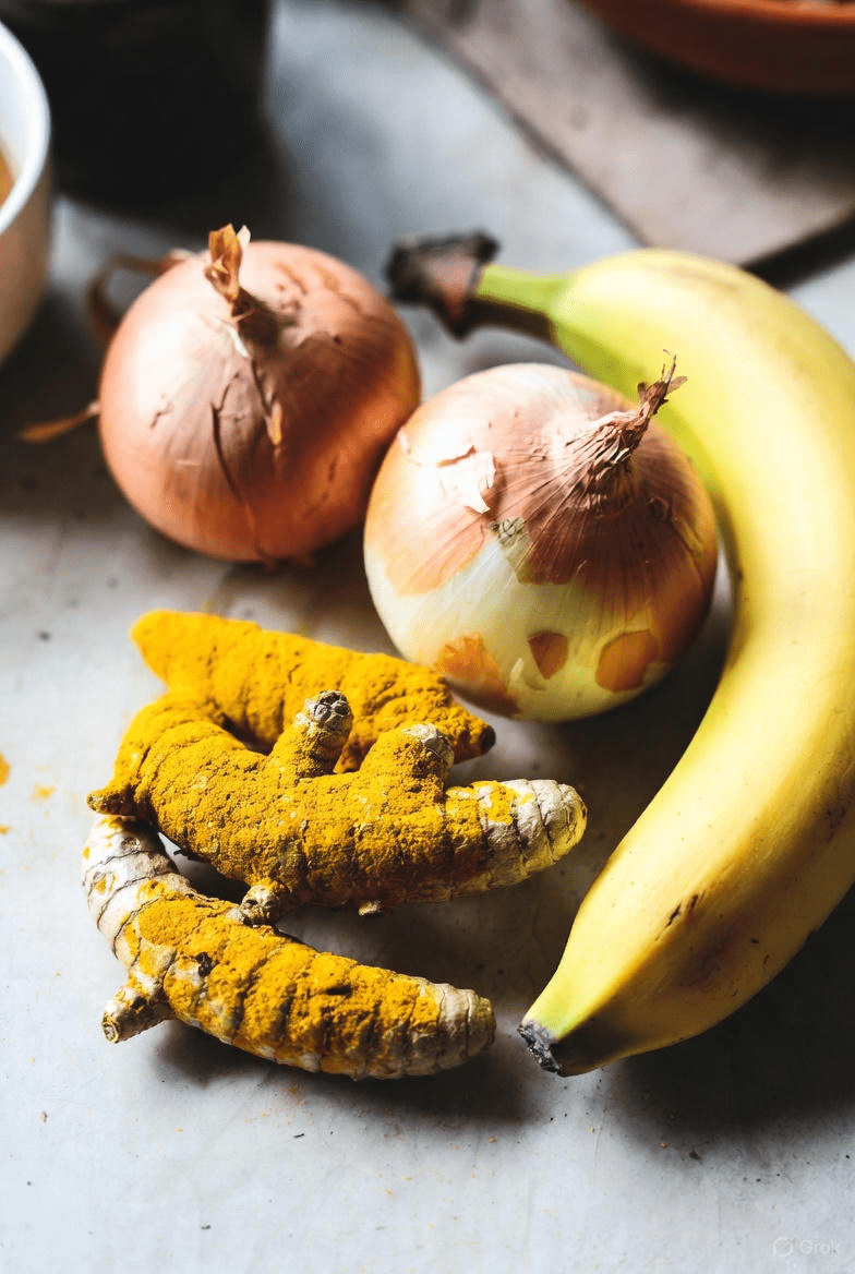 First, gather your items: one ripe banana, a small onion, and fresh turmeric root or powder.