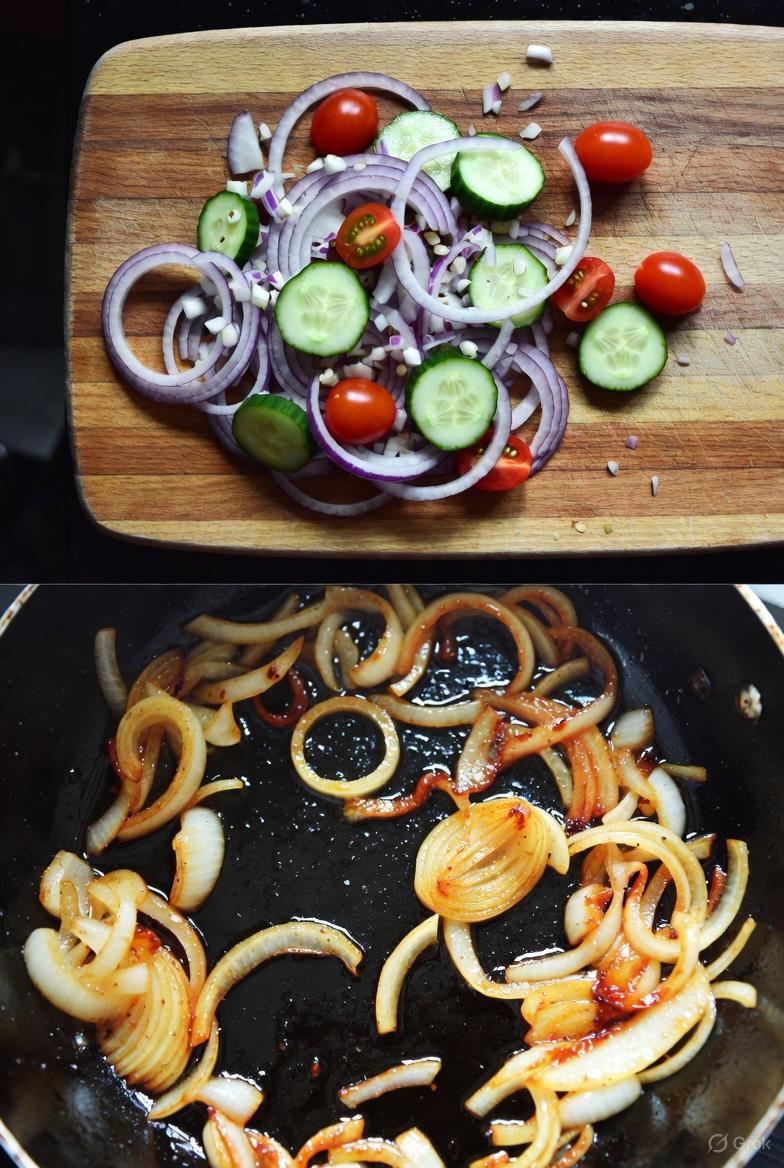 - Slowly cook sliced onions in a pan until golden.