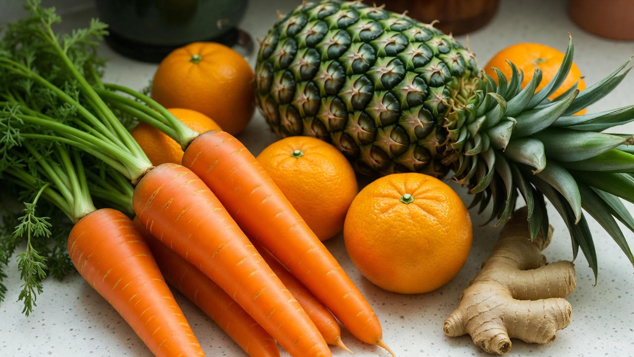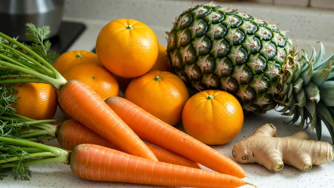 - Gather 2 medium carrots, 2 large oranges, 1 thick slice of fresh pineapple, and a small 1-inch piece of fresh ginger.
