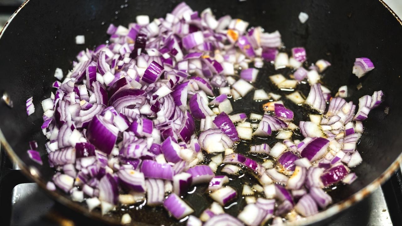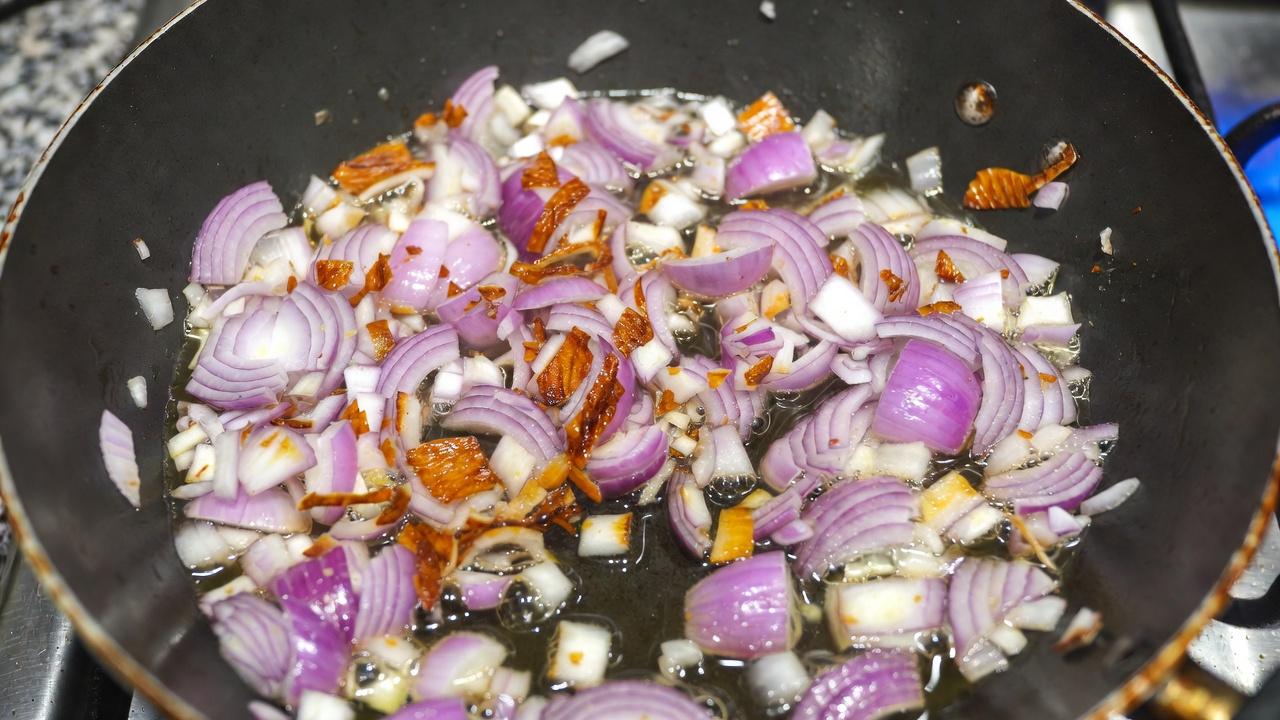 - Add the onions and simmer gently for 10-15 minutes until the oil takes on a deeper color.