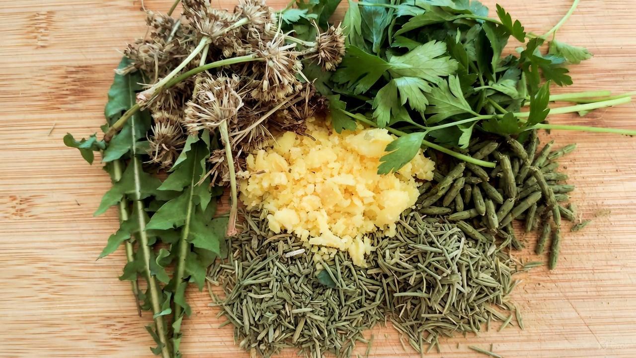 - Add the dandelion leaves, grated ginger, horsetail, and chopped parsley.