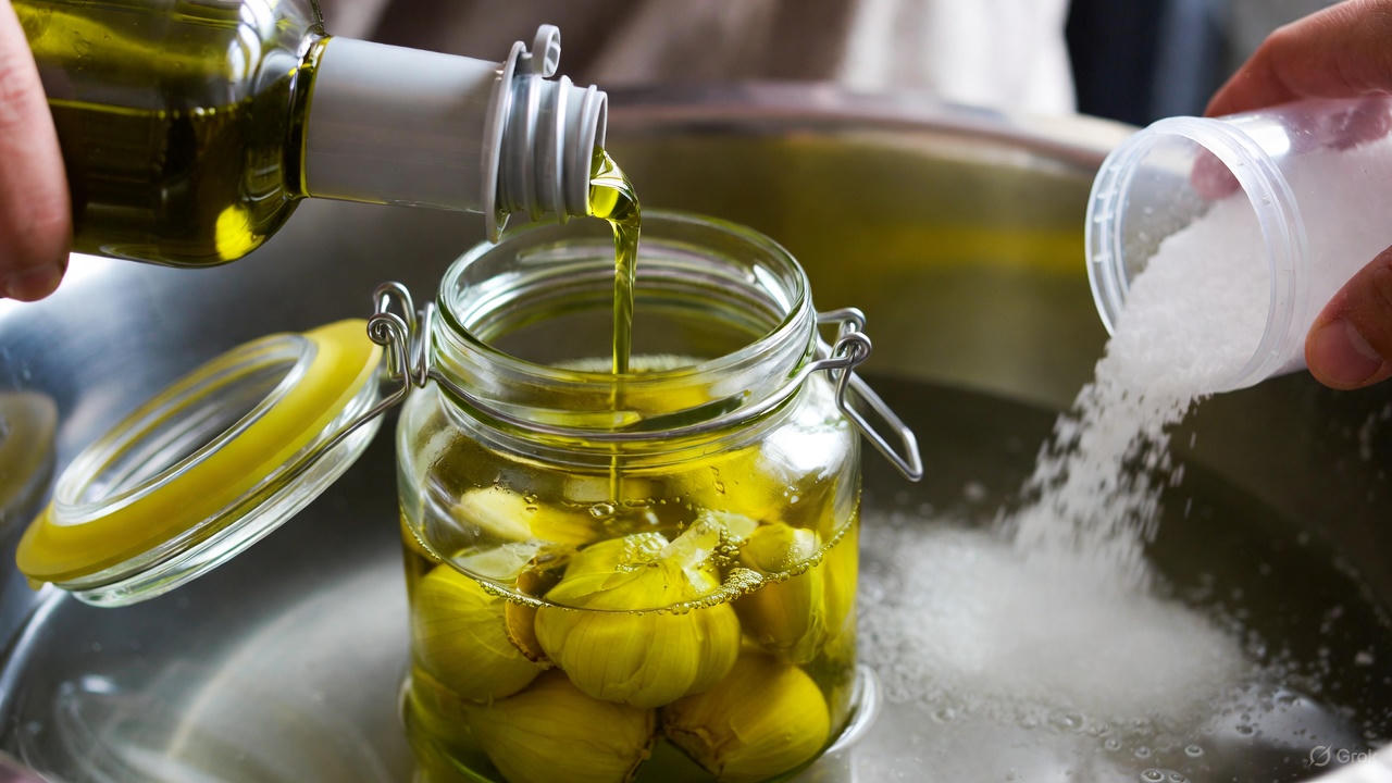 4. Cover completely with extra-virgin olive oil or coconut oil (about 1 cup).