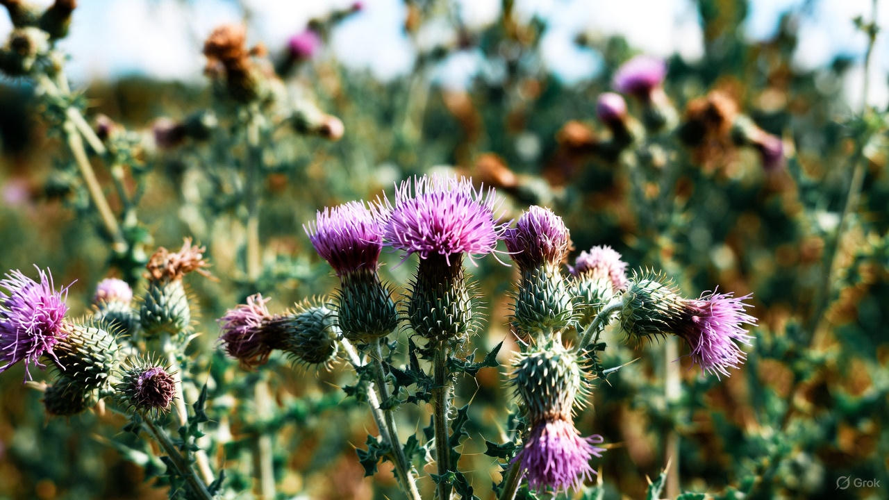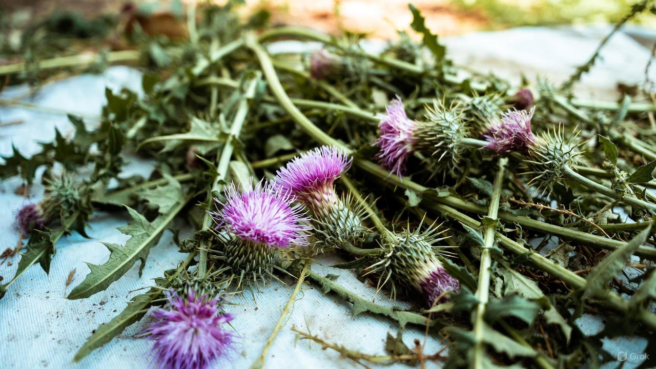 Milk thistle is a flowering herb from the daisy family, known for its purple blooms and spiky leaves.